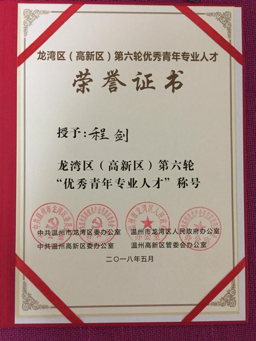 祝賀方圓儀器副總工程師程劍先生榮獲溫州市龍灣區(qū)(高新區(qū))第六輪“優(yōu)秀青年專業(yè)人才”稱號(hào)